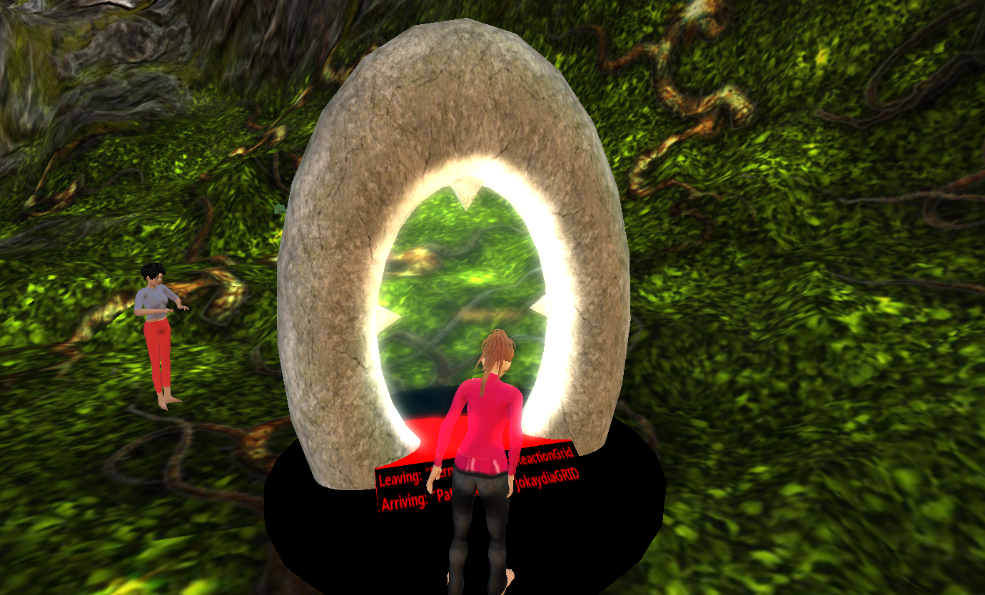 I joined an international group of “Gridizens” a couple of nights ago to experience a hypergrid. Our Avatars teleported from one grid to another. In this case we teleported from Reaction Grid to Jokaydia. The technical aspects are explained on the Opensim wiki. Hopping from one grid to another – hypergridding – is like linking from one website to another. We do that everyday on the 2D web without really thinking too much about it, and many create those links in wikis, blogs, and in social networking and bookmarking pages. A virtual world is a little more complicated because you have an agent or avatar that is entering the grid. Typically, the user needs to register in each of the worlds and use a different avatar or agent, so the benefit of the hypergrid is that it allows you to use the same avatar in each of these worlds.