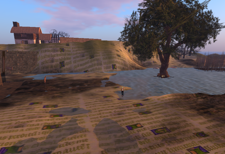 The use of Virtual Worlds to explore and enhance the literary experience is a useful activity for pre-reading, ongoing as a specific piece is read, and/or as reinforcement after the reading is complete. The value of a virtual world in studying literature is realized as students transport into a time and place that is unfamiliar, a setting that makes a classic piece of literature more familiar, engaging and relevant. The Pardoner Sim on Second Life http://slurl.com/secondlife/Sunray/7/121/21 provides artistic interpretation and fun as an avatar walks the terrain of old style text, along the trail left by the Canterbury pilgrims and among the unmistakable landmarks of the story. The sim provides an open-ended way to interact with the virtual environment as parts of the story are revealed. Surprises, created by scripts that are activated upon avatar contact, reveal elements of the dark story that contribute to making connections and understanding of Chaucer’s work.