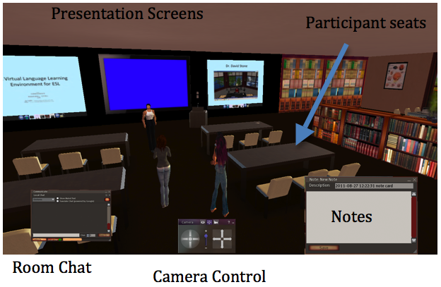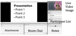 In a virtual world educational setting the lecture contains similar elements with some unique distinctions. Again, text and audio communication abilities, note-taking, recorded sessions and non-disruptive side communications are the norm. The obvious difference is visible in the comparison of the two screenshots posted here. A virtual world provides a visual setting that is very much like a real world setting, though it could be placed in some extraordinary setting for added fun. A camera control allows the participant to look around the room and zoom into a presentation slide much like happens in a face-to-face presentation. Attending a Virtual World presentation provides a “game” look and feel, considered by some as silly and unnecessary and by others as more engaging and natural.