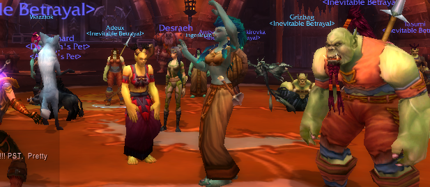 My Orc character dances with fellow EDU orcs at the end of the evening on Day 1 of my WOW experience. Good to have friends, in any world.