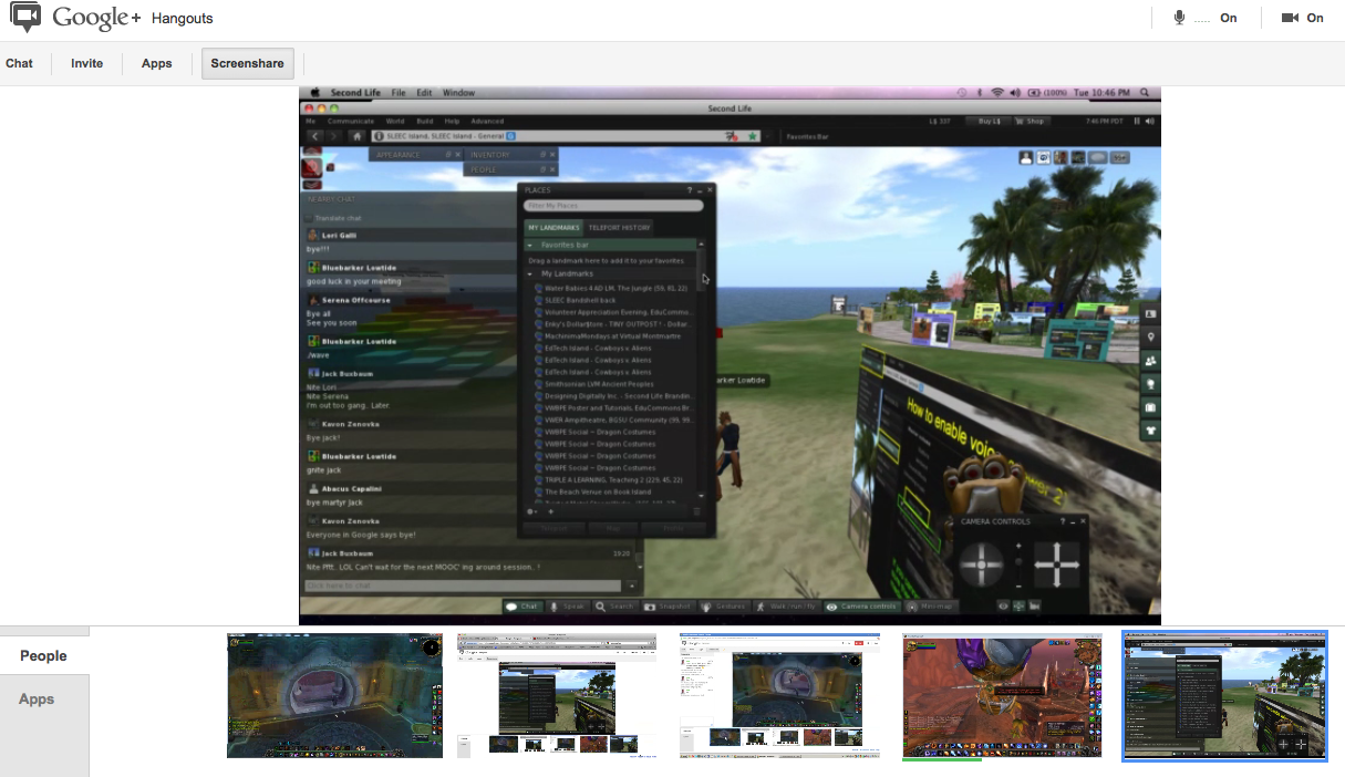 Those who teach or meet in immersive settings must often take time to troubleshoot technical issues or coach newcomers on basic functions and tasks. With the large number of Virtual Worlds, Browsers, Browser Versions, OS Versions, and setting variables it is helpful to actually “see” the other person’s screen to be able to direct them adequately. I was personally the recipient of this type of “distant coaching” through Google Hangout. I was able to share my screen and describe what I was attempting to do and in turn received very direct direction and feedback to support my objective. At the same time I was able to view others’ screens and have them demonstrate precisely what I needed to do.